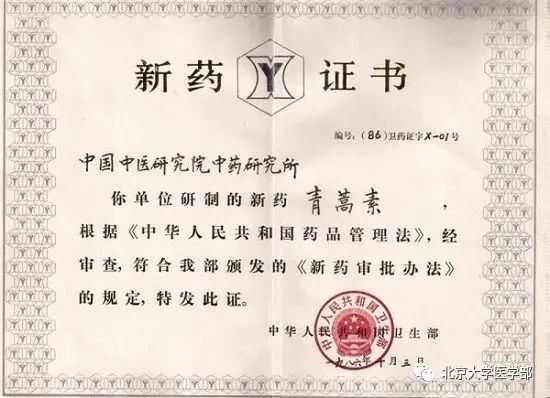 1986年10月3日,“青蒿素”获得了国家颁发的一类新药证书。