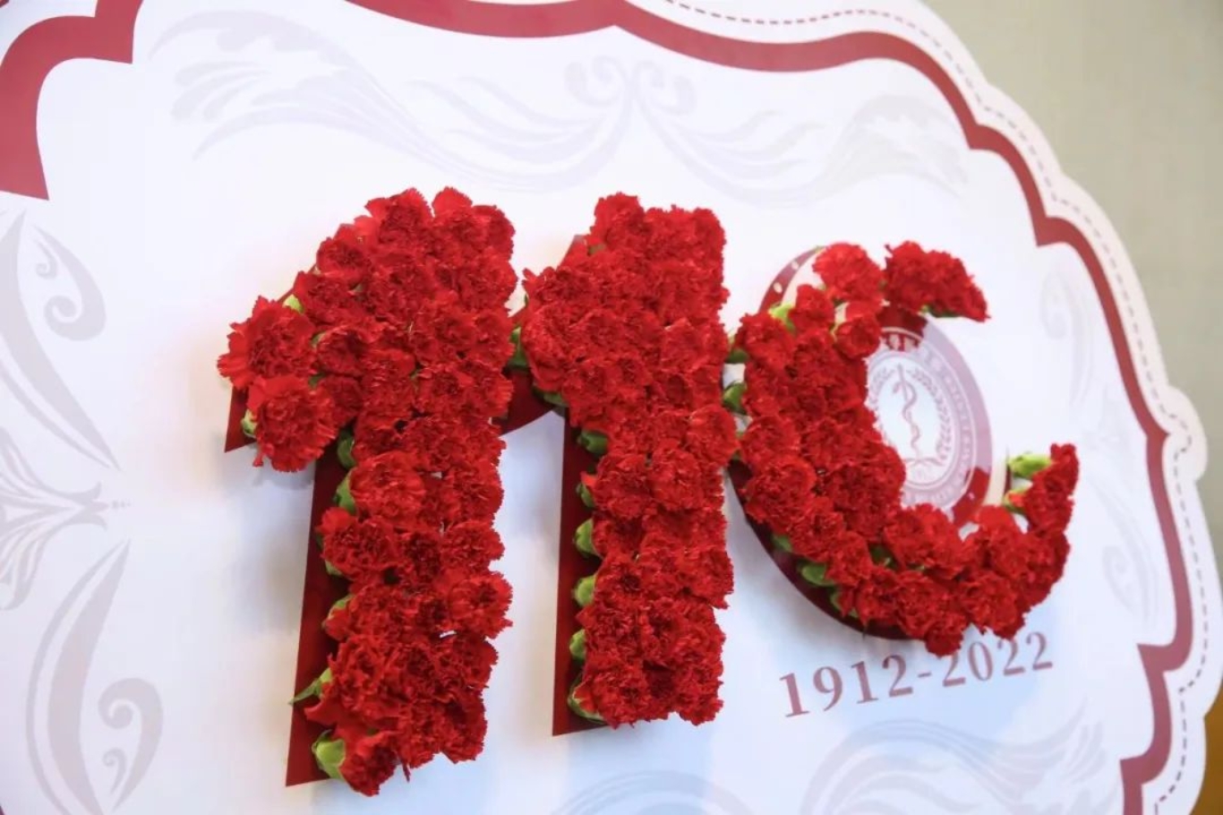 由获奖医师和嘉宾们亲手插制的110朵康乃馨花架推到舞台中央,表达了对北大医学办学110周年的祝福!希望北大医学的明天会更加辉煌!