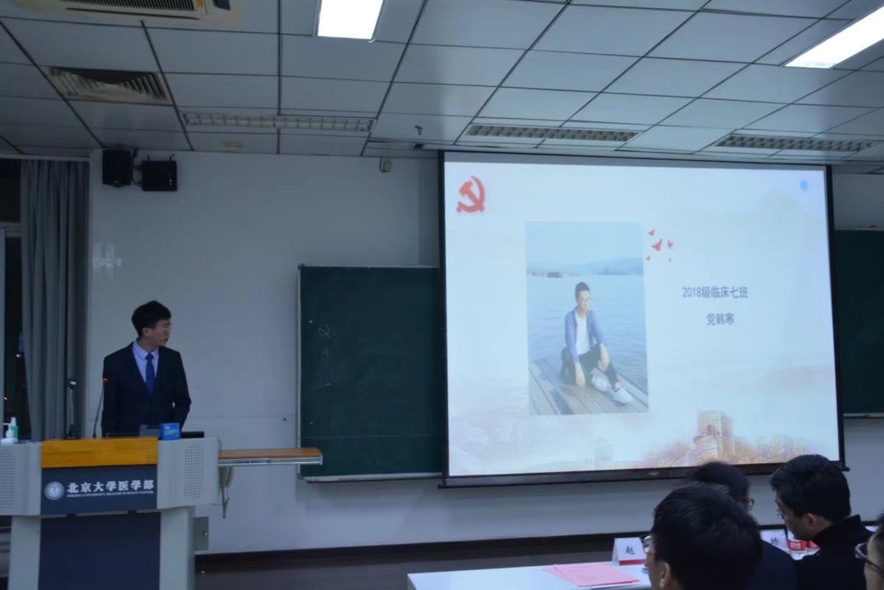 2020年12月3日晚,北京大学基础医学院第八期入党积极分子培训班小组汇报暨结业典礼在逸夫楼631教室举行。出席活动的学院老师有北京大学基础医学院党委委员、心血管所党支部书记郑乐民,本科生党支部书记赵姗,支部青年委员柏豪。活动还特别邀请了本科生党支部的兼职组织员,他们是医学部后勤党委书记赵成知,医学部研究生招生办公室主任张皓,医学部党委组织部综合办公室副主任许申,医学部后勤党委李欣欣。参加结业典礼的还有参加本次培训班的一百多名入党积极分子。