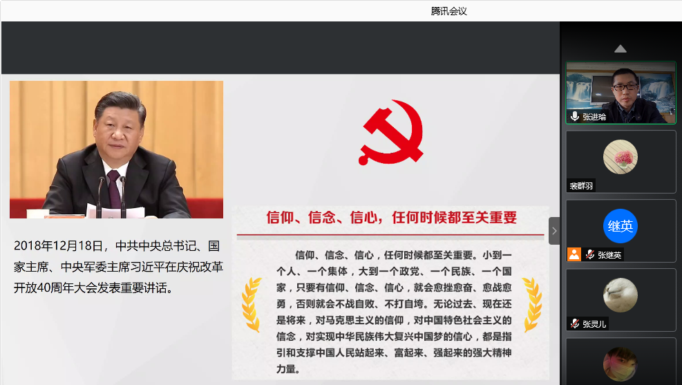 张永明以李大钊先生的《艰难的国运与雄健的国民》一文作引,联系我们党带领全国人民抗击新冠肺炎疫情的英勇实践,点明了我们在面临困难时应持有的正确认识和态度:“历史的道路,不全是平坦的,有时走到艰难险阻的境界,全靠雄健的精神才能冲过去”。这也正如习近平总书记在庆祝改革开放40周年大会上的重要讲话中所讲到的,“信仰、信念、信心,任何时候都至关重要”。接下来,张永明带领大家一起回顾了我们党历届党章的制定、修订背景和主要特点,通过党章的“变与不变”,大家更深刻地领悟了马克思主义一脉相承、与时俱进的理论品质,也加深了对中国共产党成立百年来始终坚持为中国人民谋幸福、为中华民族谋复兴的初心和使命的理解和认识。