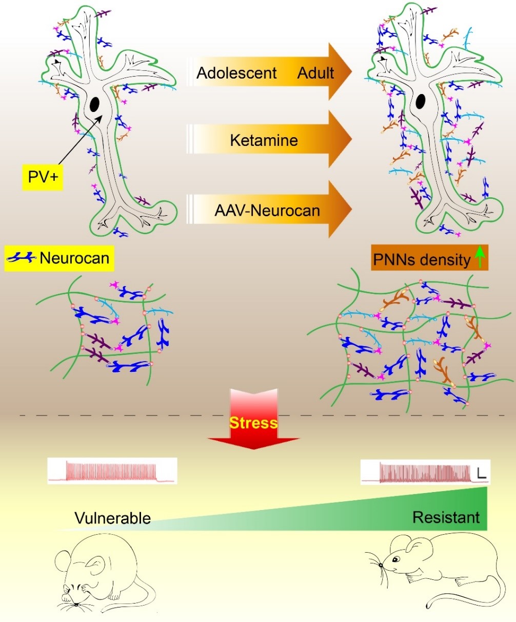 神经元周围基质网络(perineuronal nets, PNNs)是中枢神经系统中的一种细胞外基质结构,呈网状包绕在小清蛋白(parvalbumin, PV)阳性的GABA能中间神经元周围,具有屏障保护的作用,这种屏障结构一旦被破坏,就会影响GABA能中间神经元的功能,从而导致神经精神疾病的发生。PNNs的形成与个体发育密切相关,在出生后发育的关键期迅速增加,在关键期结束时达到峰值,至成年后达到稳定,而青春期是影响PNNs结构形成的关键时期。既往研究表明,成年期PNNs密度与抑郁症的发病关系密切,但PNNs及核心组成蛋白是否参与青春期抑郁症的发生未见报道,同时PNNs是否参与介导氯胺酮的快速抗抑郁作用尚不清楚。