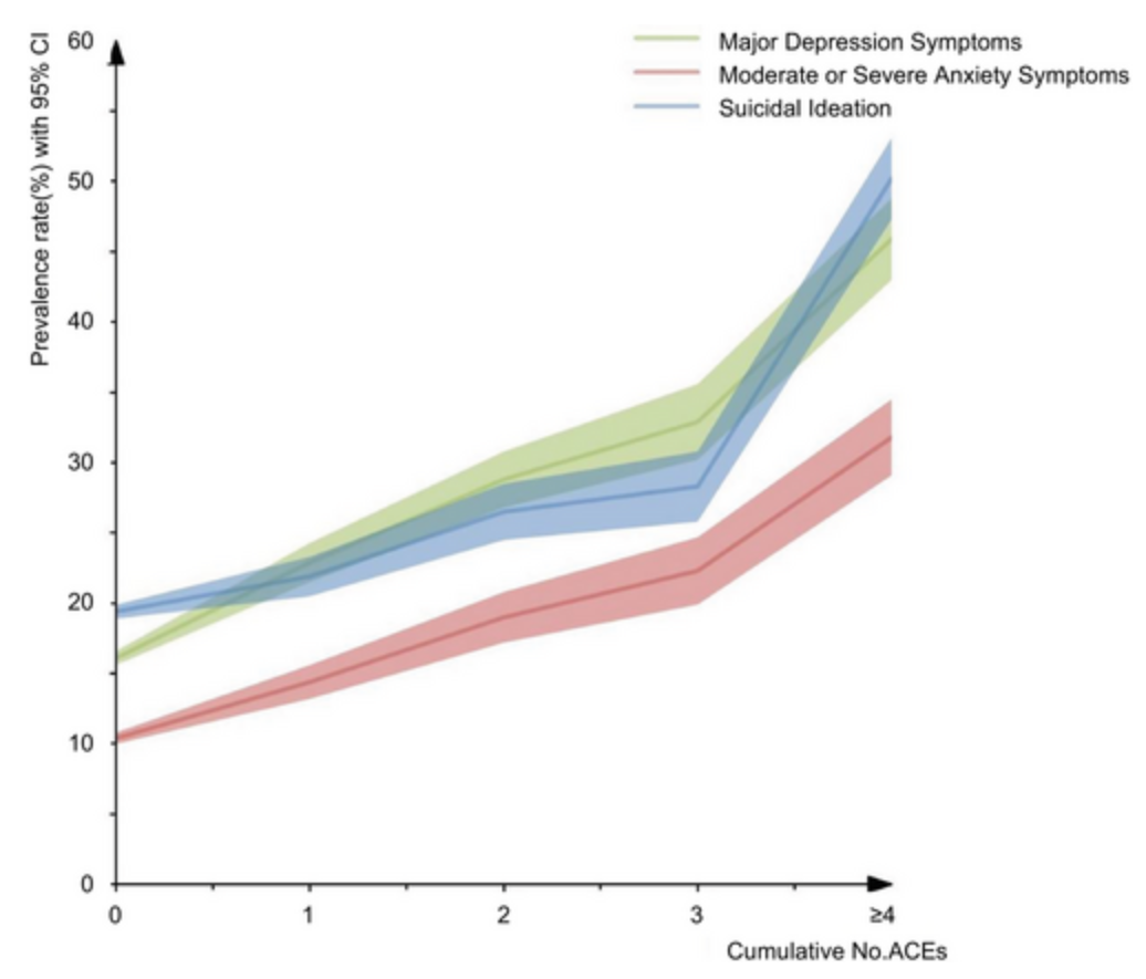 研究发现,26.0%调查对象曾至少经历过一种类型ACE。ACE的分布存在明显差异,其发生模式因社会人口特征的不同而呈现异质性。研究进一步表明,在中国成年人群中,ACE累积数量与抑郁症状、焦虑症状及自杀意念之间存在剂量-反应关系。在各类ACE中,性虐待与上述心理健康问题之间的关联强度最高。
