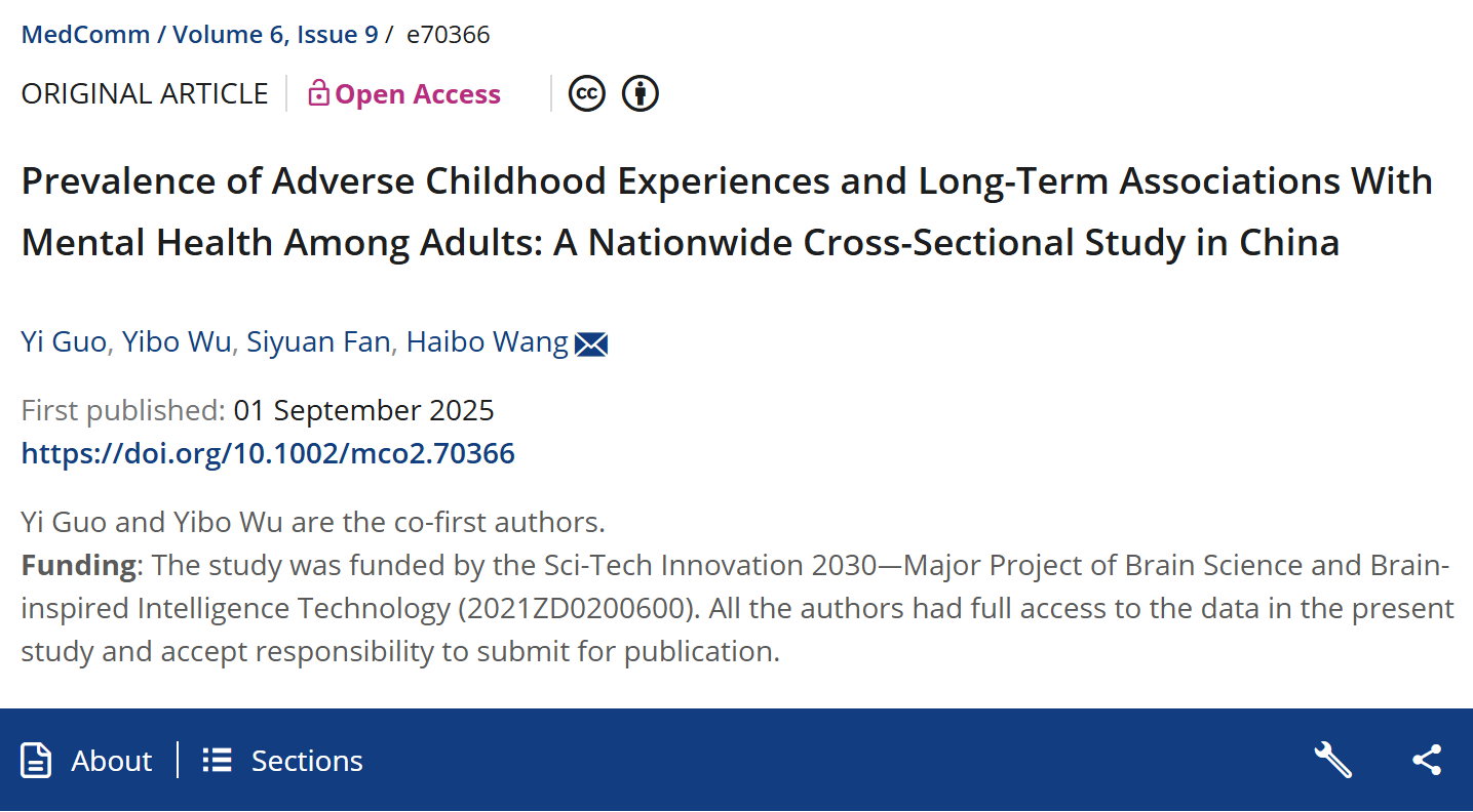 近日,北京大学临床医学高等研究院临床研究所汪海波研究员团队在中科院一区Top期刊 Medcomm 在线发表题为“Prevalence of Adverse Childhood Experiences and Long-Term Associations With Mental Health Among Adults: A Nationwide Cross-Sectional Study in China”的最新研究成果。北京大学临床医学高等研究院临床研究所博士研究生郭怡、浙江大学附属第四医院、国际健康医学研究院吴一波副研究员为论文共同第一作者,北京大学临床医学高等研究院临床研究所汪海波研究员为论文通讯作者。