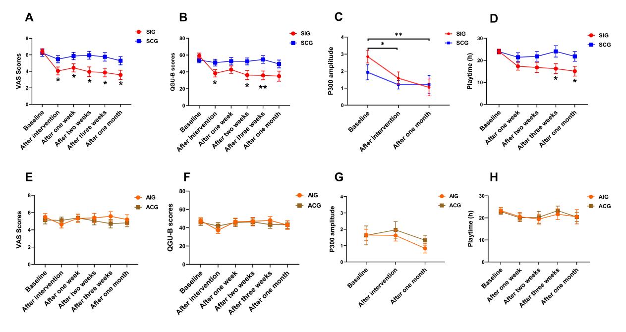 图2.渴求程度与游戏时间在干预前后及随访的变化。A-D分别为睡眠干预(SIG)组和睡眠对照(SCG)组的VAS分数、QGU-B分数、P300振幅以及游戏时间在干预前后及随访的变化;E-H分别为清醒干预(AIG)组和清醒对照(ACG)组的VAS分数、QGU-B分数、P300振幅以及游戏时间在干预前后及随访的变化;