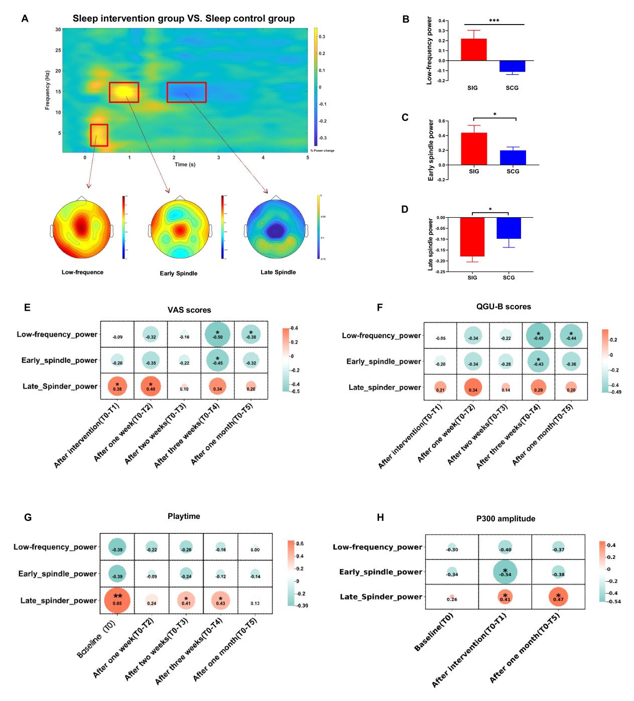 图3. 睡眠干预组和睡眠对照组在两晚干预中声音诱发的三个时频成分能量的比较及其与渴求和游戏时间降低的相关性。A睡眠干预组和睡眠对照组在两晚干预中声音诱发的差异时频图;(B-D)睡眠干预组和睡眠对照组在两晚干预中声音诱发的三个时频成分能量的比较;(E-H)睡眠干预组中三个时频成分的能量与渴求和游戏时间降低的相关性。