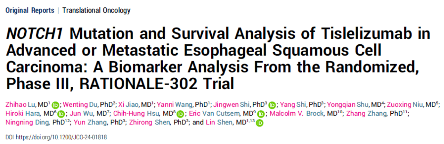 2025年4月3日,北京大学肿瘤医院沈琳教授团队联合百济神州团队在Journal of Clinical Oncology (《临床肿瘤学杂志》,影响因子: 42.1)上发表了题为“NOTCH1 mutation and survival analysis of tislelizumab in advanced or metastatic esophageal squamous cell carcinoma: A biomarker analysis from the randomized, phase 3, RATIONALE-302 trial”的研究论文。研究显示,NOTCH1突变在晚期ESCC中可作为替雷利珠单抗(PD-1抑制剂)治疗的预测标志物,并通过临床转化研究揭示了NOTCH1突变或表达下调在重塑肿瘤微环境中的作用,从而为患者筛选和联合治疗提供了新的思路。
