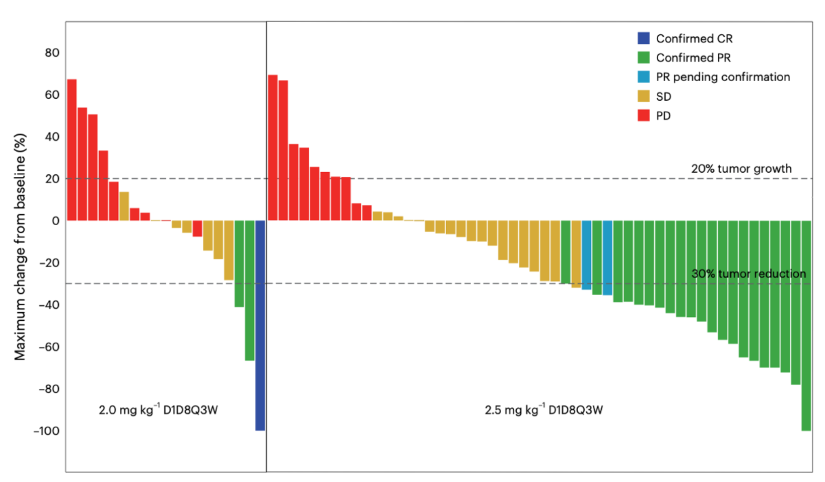 安全性方面,在2.5mg/kg组,最常见的不良反应包括贫血(85.0%)、血小板减少(58.3%)、白细胞减少(56.7%)以及中性粒细胞减少和恶心(均为46.7%)。在≥3级TRAE中,最常见的是贫血(28.3%),其次是白细胞减少和血小板减少(均为18.3%)和中性粒细胞减少(16.7%)。在2.0mg/kg组,最常见的不良反应为贫血(86.4%)、白细胞减少和乏力(均为45.5%)、血小板减少(40.9%)以及中性粒细胞减少和恶心(均为31.8%)。在≥3 级TRAE中,最常见的是贫血(27.3%)、淋巴细胞计数减少(13.6%)以及白细胞减少和中性粒细胞减少(均为9.1%)。