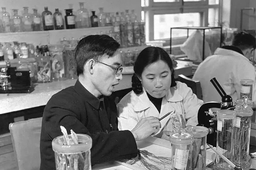 1951级校友屠呦呦在老师楼之岑院士指导下开展学习和研究。
