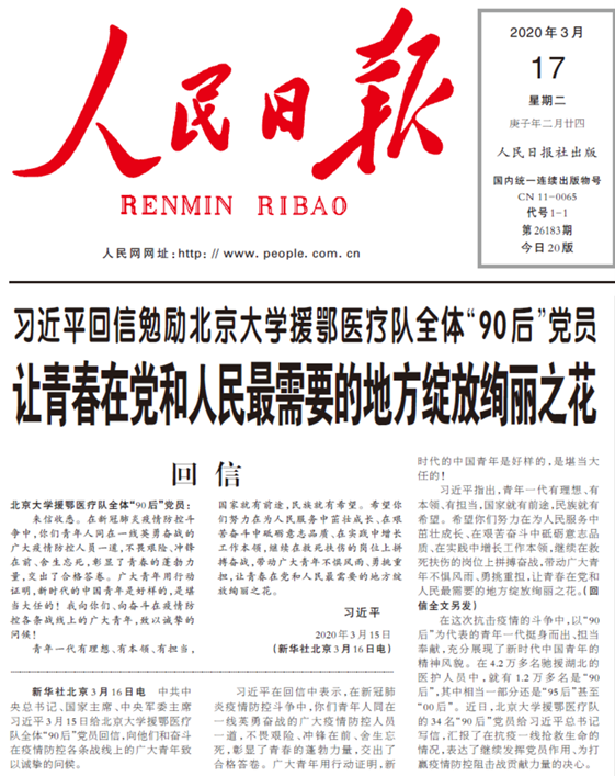 ——习近平给北京大学援鄂医疗队全体“90后”党员的回信(2020年3月)