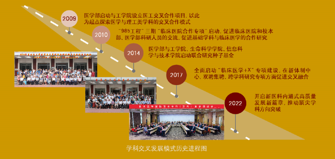 自2009年“医-工”交叉合作模式探索的“星星之火”,到“985”三期启动“临床医院合作项目”的初步成熟,并拓展到“医-工、医-生、医-信”多学科的交叉融合,再到2017年全面启动“临床医学+X”建设,医学与多学科的融合创新呈“燎原之势”发展。2022年开启了新医科内涵式高质量发展的新篇章,推动顶尖学科方向突破发展。