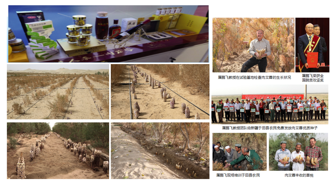 屠鹏飞教授团队潜心新疆、内蒙古等西北沙区30多年,创建沙漠濒危寄生中药肉苁蓉的优质高产栽培,推广种植梭梭和红柳600多万亩,接种肉苁蓉230万亩,年产药材7500吨;研发苁蓉总苷胶囊等系列药品和健康产品,打造了肉苁蓉全产业链。治理大片沙漠,带动20余万沙区人民致富,取得了巨大的生态、经济和社会效益。