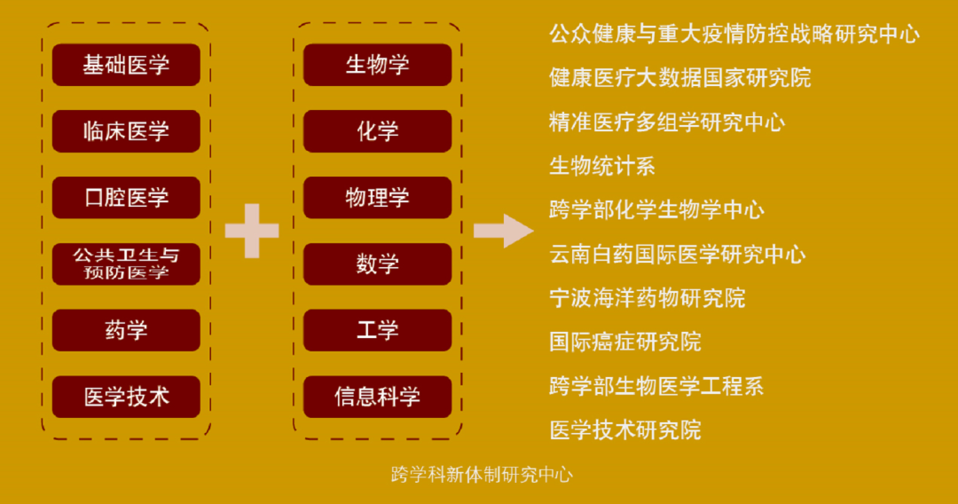 面向国家在重大突发传染病防护、健康医疗大数据应用体系建设,多组学关键技术攻关、创新药物研发、慢病防控、精准医学、高端医疗设备研发等方面的科技创新战略布局,医学与理工多学科融合,成立多个新体制中心,科研协同创新平台建设取得长足进展,服务国家战略。