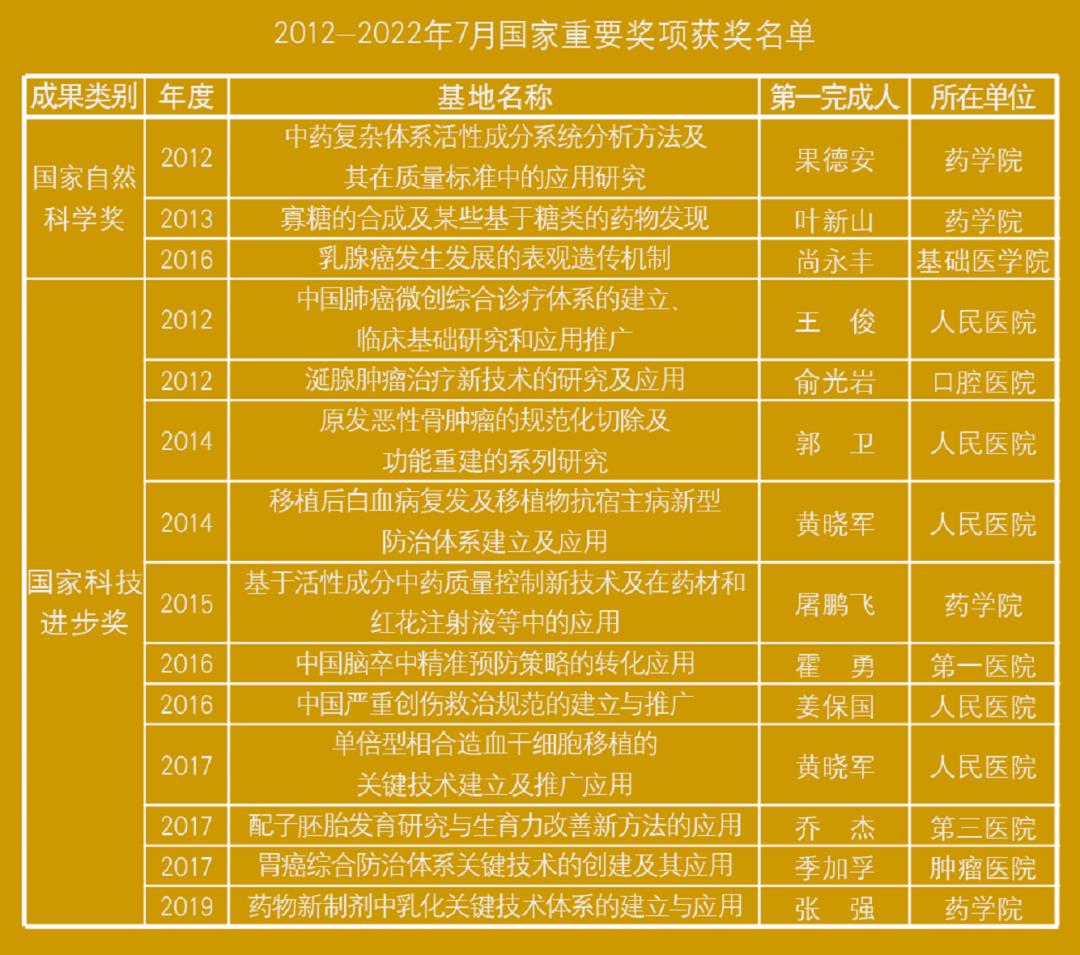 2012年-2022年7月,北大医学牵头荣获各级各类科技奖励413项,其中国家科学技术奖14项、北京市科学技术奖40项、教育部高等学校优秀成果奖(科学技术)48项。4项成果入选国家“十三五”科技创新成就展,其中1项成果在2022年4月召开的中国医学发展大会上被评为“中国21世纪重要医学成就”。