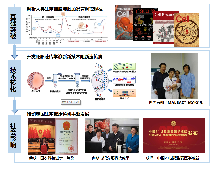 北京大学乔杰、谢晓亮、汤富酬教授团队,在系统解析人类生殖细胞和胚胎发育遗传特征及表观遗传调控规律的基础上,国际首次建立了一次测序完成胚胎三重诊断的新方法,诞生世界首例“MALBAC”试管婴儿。在此基础上,北京大学第三医院乔杰团队不断开发新技术,攻克各种复杂致病突变的诊断难题,完成临床转化,并推广至国内外50余家单位,使数千例深受遗传病困扰的家庭获益。团队在该领域的工作面向生殖健康的重大需求,获得广泛社会认可。
