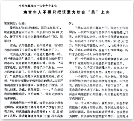 叶恭绍马上给这位女孩回信,首先通过她的自我 描述分析她现在所处的情况,并且告诉她,虽然1.55 米不算高个子,但仍然属于正常范围,全国体质调研的结果显示,17岁女孩的平均身高是1.60米,她离平均值差得不太远。之后,叶恭绍还劝说女孩不要胡乱吃药,并且吿诉她要在德智体美四个方面良好地发展,哪怕她认为现在自己已经"不美"了,但若在德智体三方面正确地把自己培养好,她所担心的“不美”也就不成问题。叶恭绍说:
