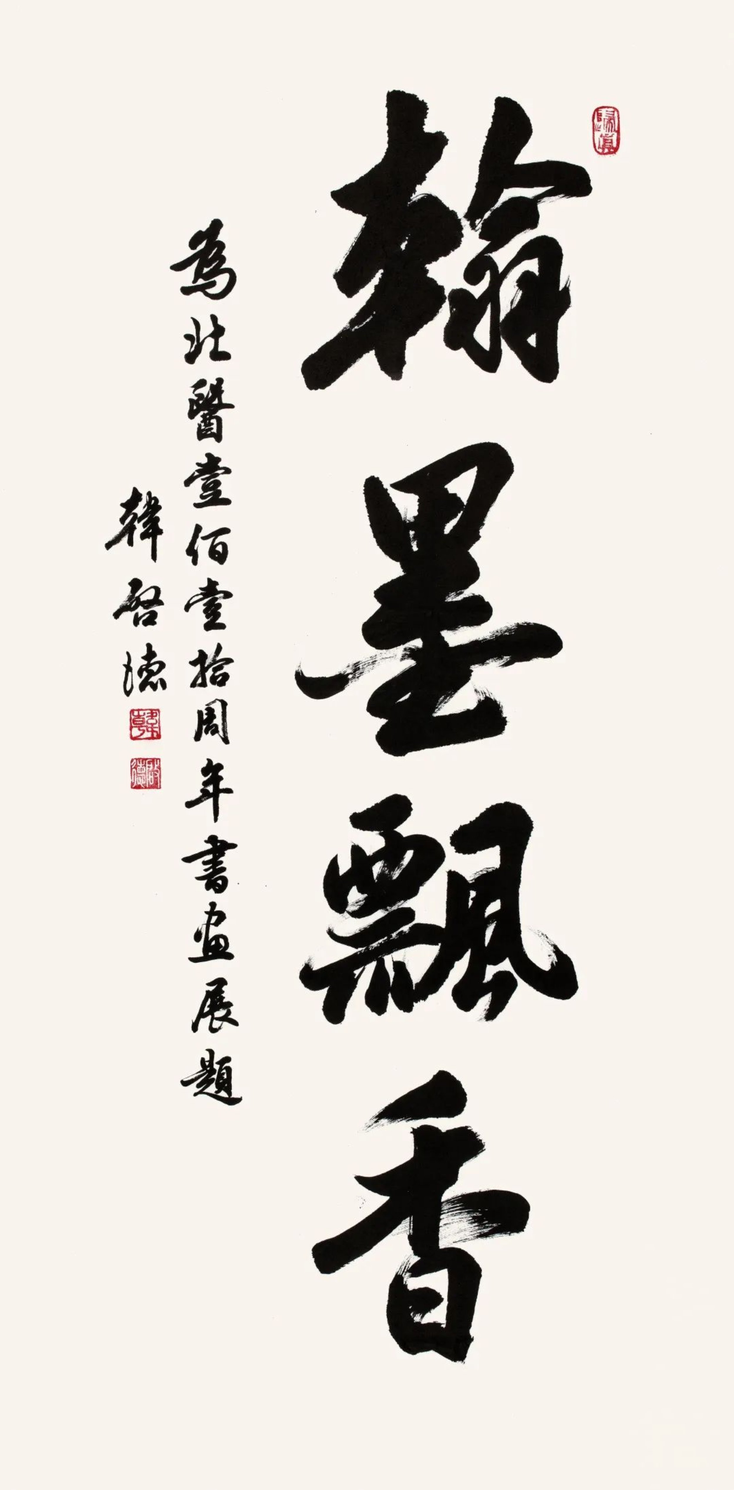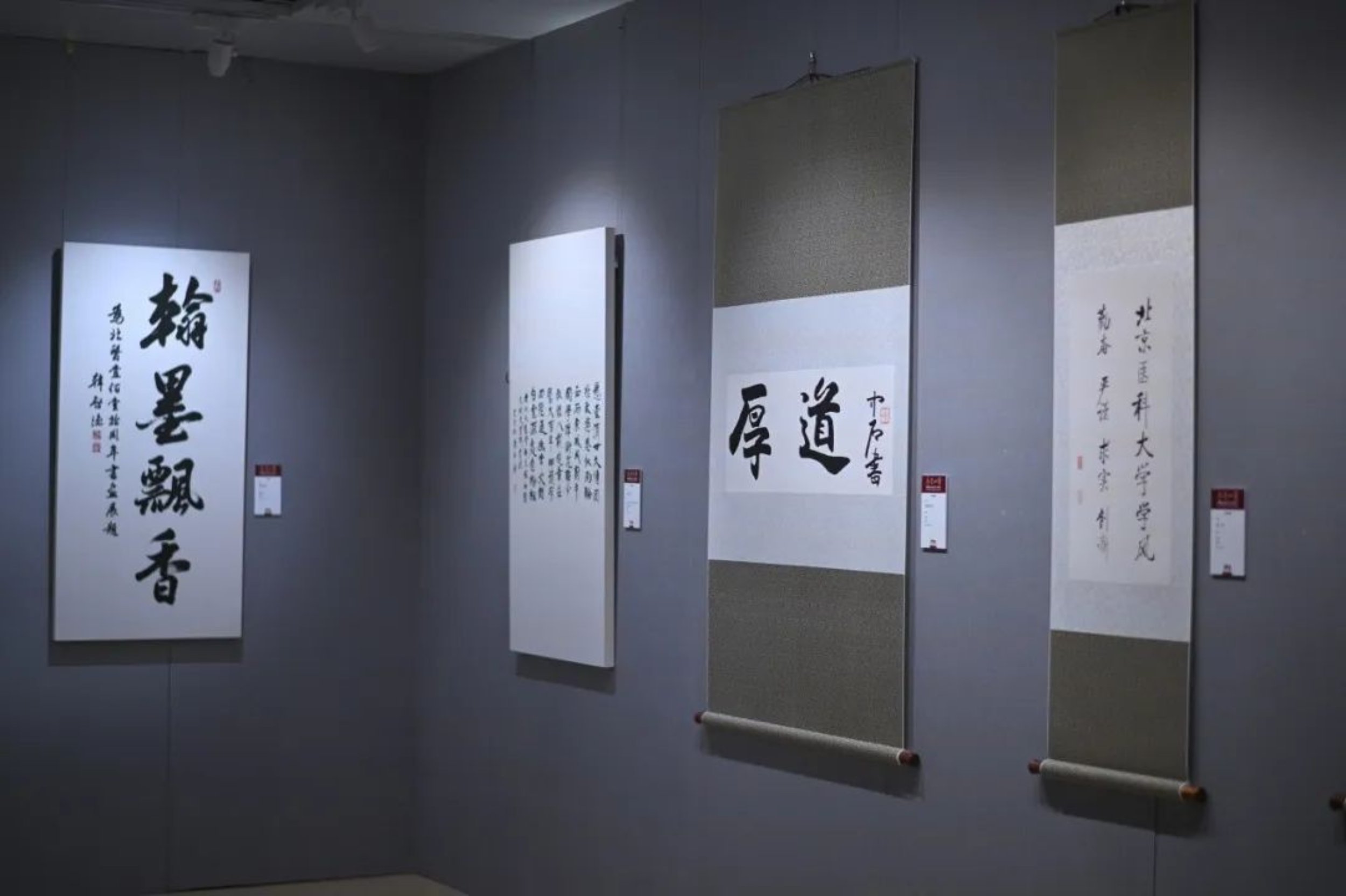 医学人文学院副书记、美学与艺术教育中心主任韩英红介绍:“当时我们正在考虑在什么地方展出征集到的师生作品,正巧接到予捷美育室负责老师的电话,说图书馆四层将来要做成一个美育室,想在10月26日图书馆重启时办一个展览,展出一些他们的藏品,问我们是否来得及征集一些老师和同学的作品一块儿展出。当时就一拍即合,我们又邀请到一些当代书法界重量级的大家作品,共同组成了如今的这个展览。”