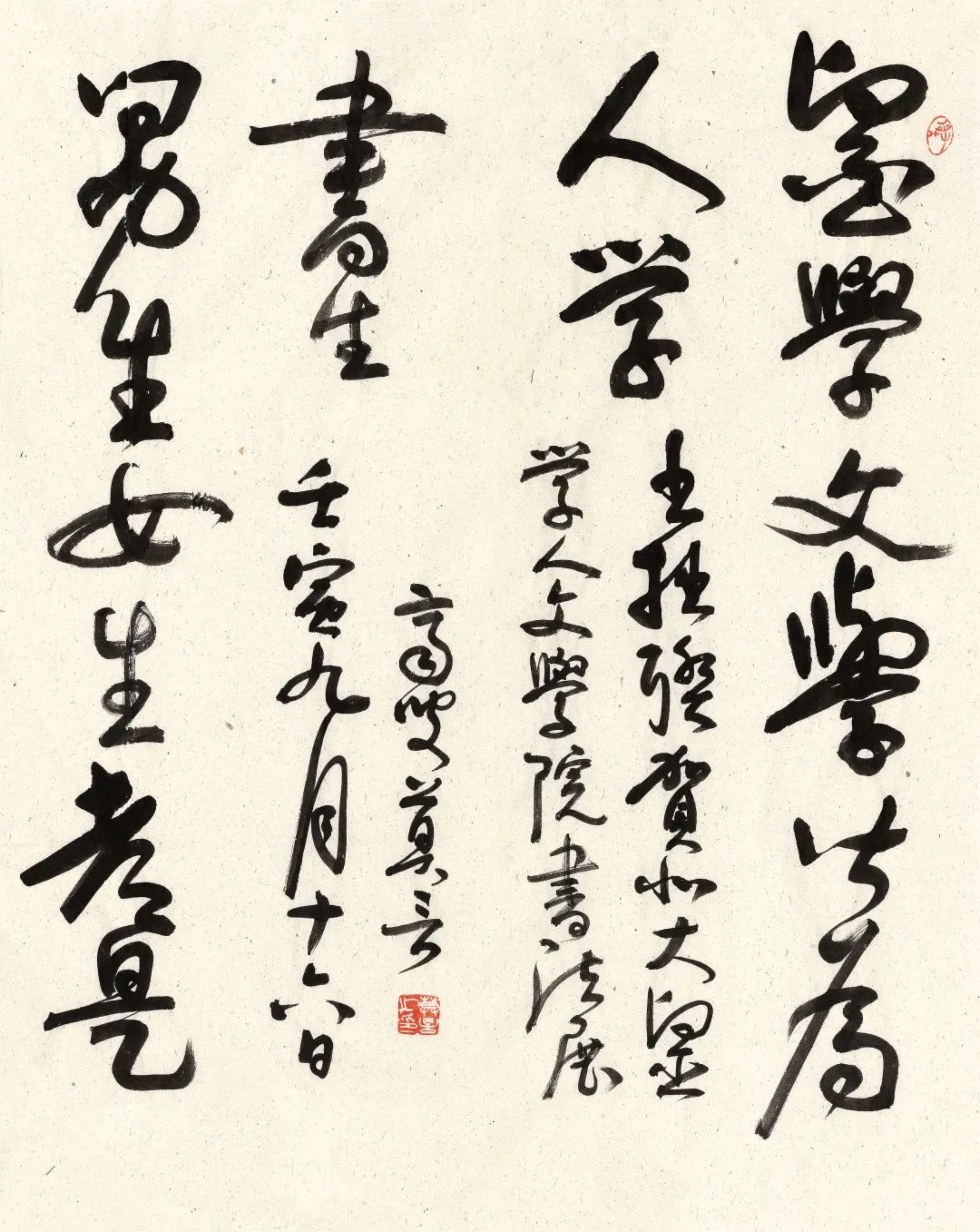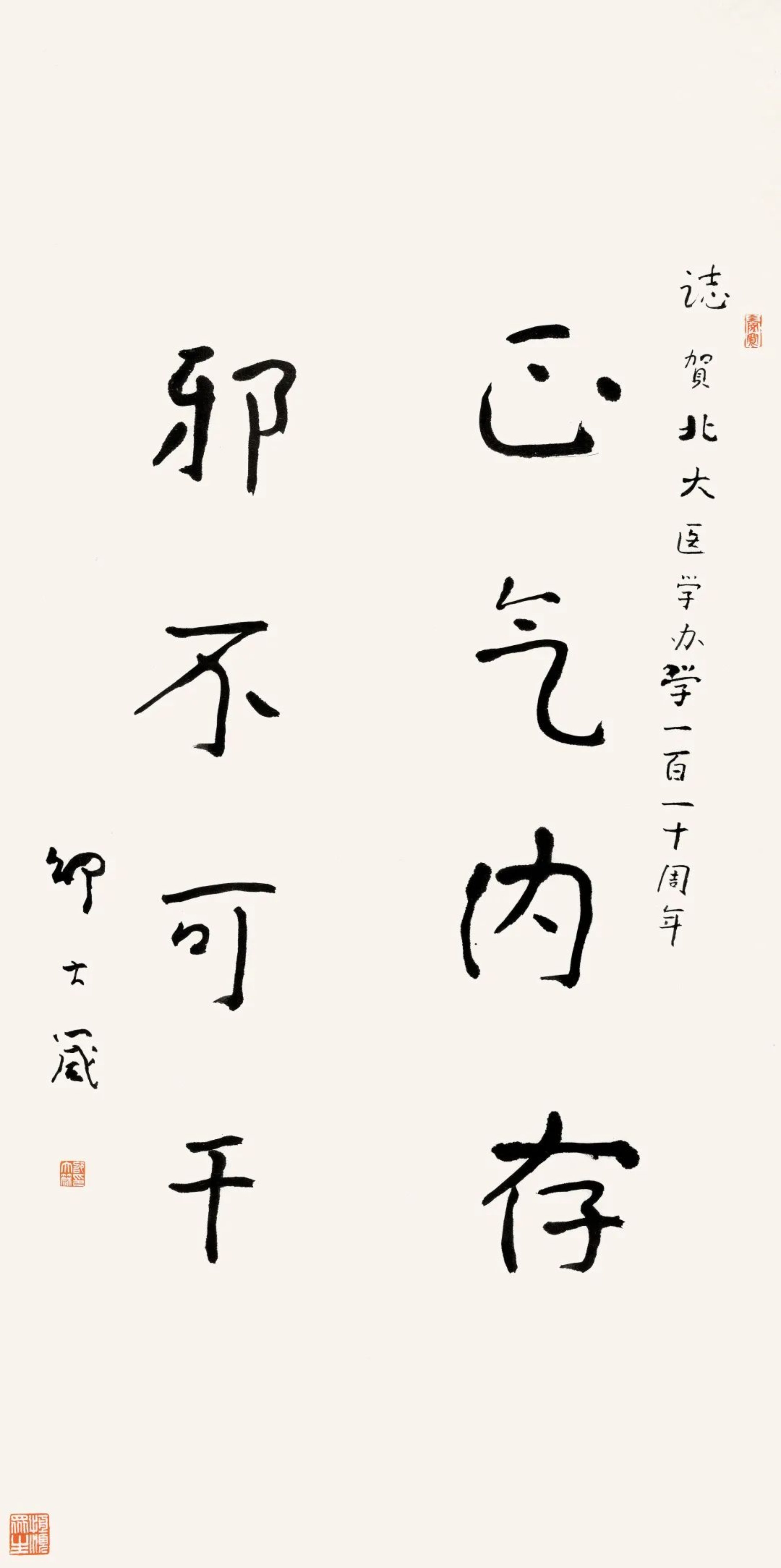著名美术理论家、美术教育家、书法家、中央美术学院教授邵大箴先生选取《黄帝内经》的内容进行创作,勉励医学生以“正气内存,邪不可干”为座右铭,做一个健康的人,也给更多的人带来健康。