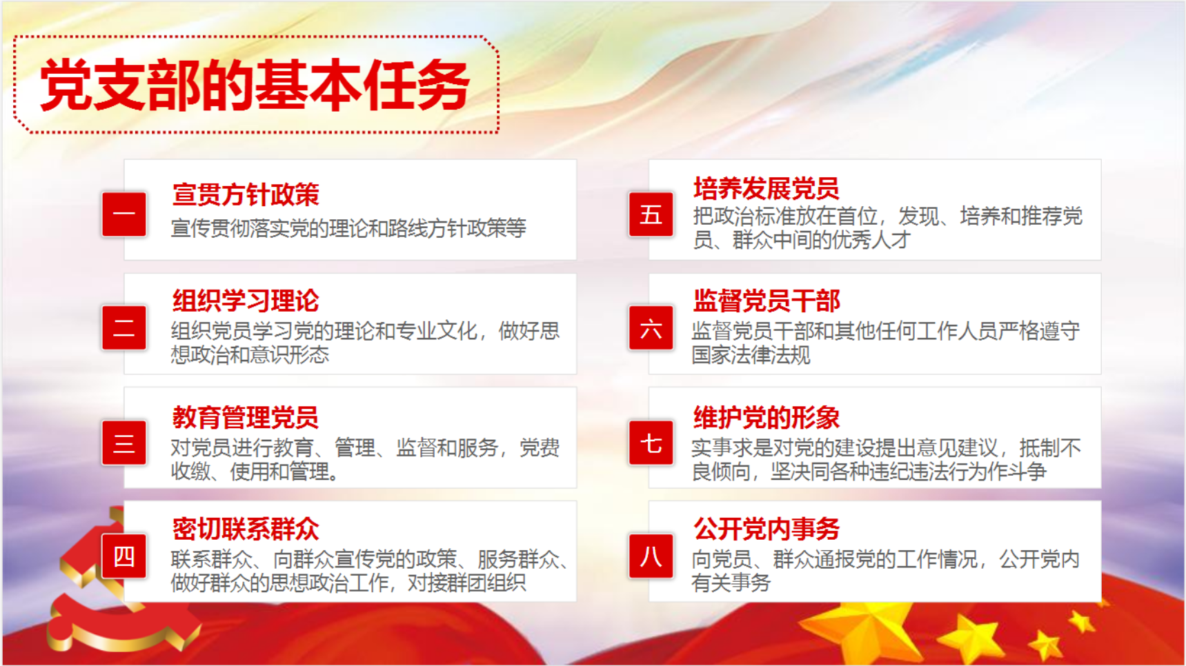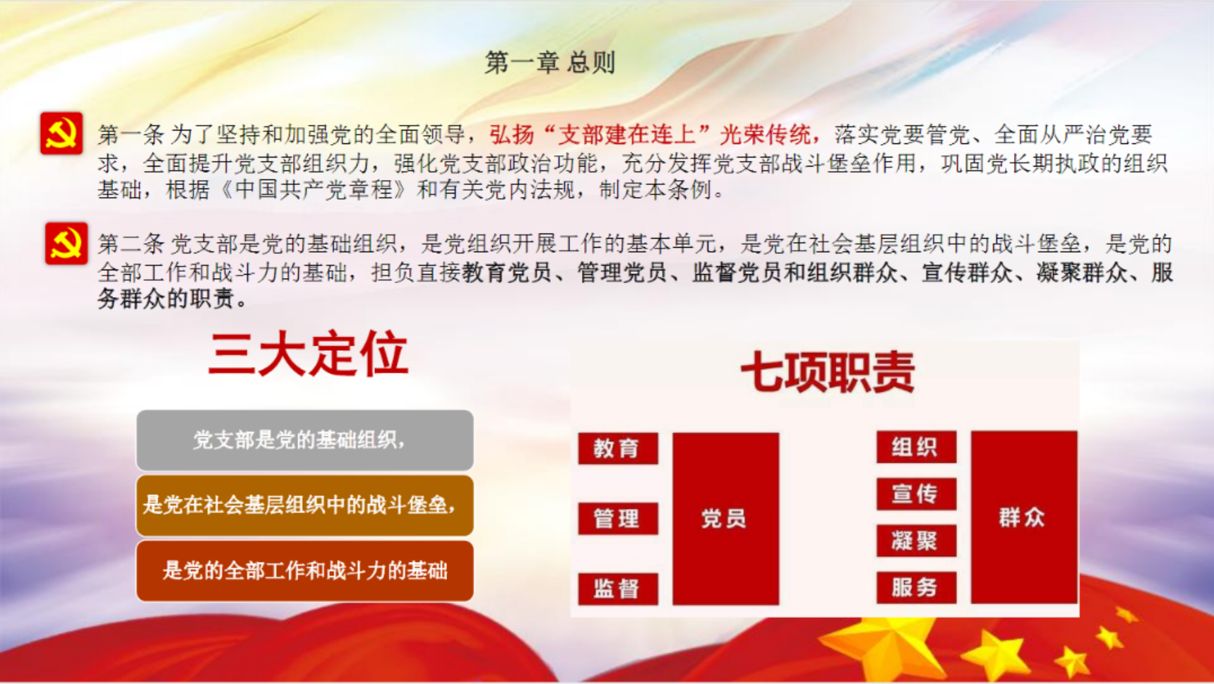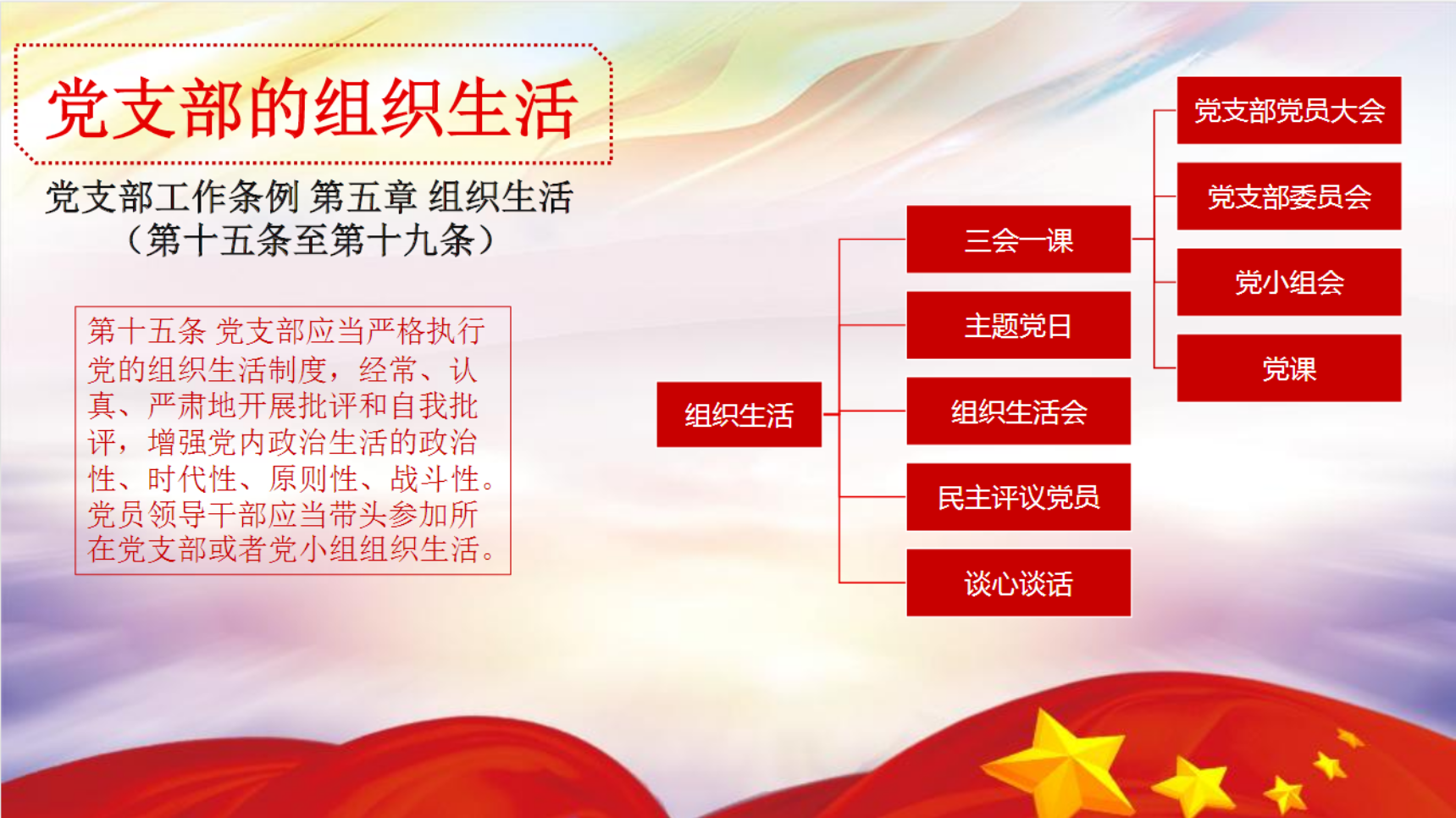 首先,大家共同学习了《中国共产党支部工作条例(试行)》。此条例的刊发是为了坚持和加强党的全面领导,弘扬“支部建在连上”光荣传统,落实党要管党、全面从严治党要求,全面提升党支部组织力,强化党支部政治功能,充分发挥党支部战斗堡垒作用,巩固党长期执政的组织基础,根据《中国共产党章程》和有关党内法规而制定。六位党支部书记结合实际工作,从支部组织设置、基本任务、工作机制、组织生活、支委会建设、领导和保障六个方面一一阐述。经过此次系统学习,各位学生党员干部进一步明确了党支部的定位、职责和基本任务,将以“两学一做”为主要内容,坚持“三会一课”常态化,在巩固马克思主义在高校意识形态领域的指导地位、加强思想政治引领、筑牢学生理想信念根基、保障学生教育教学等方面起到引领作用。各位学生党员干部更应提高自身思想政治素质,增强为国为民服务意识,敢于担当、乐于奉献,带头发挥先锋模范作用。