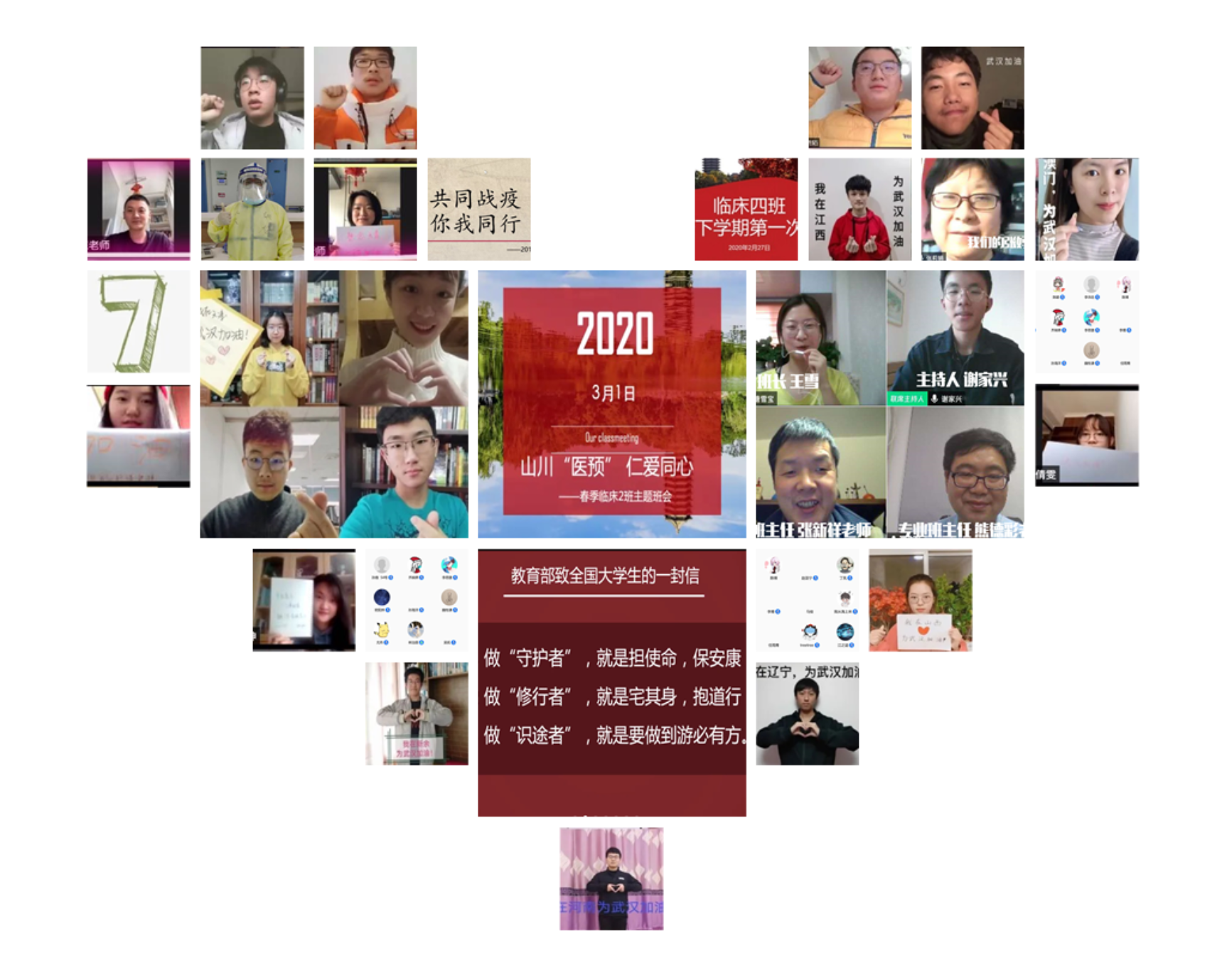 通过有组织的班会活动,医预引导新生认真学习习近平总书记在《中央政治局常委会会议研究应对新型冠状病毒肺炎疫情工作时的讲话》、《教育部致全国大学生的一封信》和《习近平给在首钢医院实习的西藏大学医学院学生的回信》等重要精神,将现实疫情素材引入同学们的专业思想教育,并开展充分的讨论和分享,在疫情的特殊时期以特殊方式开启了新学期的一次别开生面的思政云课堂。医学预科五位专职辅导员、二十位专业班主任、五位第二班主任全部积极参与,分别与各自班级同学交流讨论。多位驰援武汉一线的医务人员更是踊跃加入到班会中,与同学们分享了“抗疫”前线的经历与感悟。