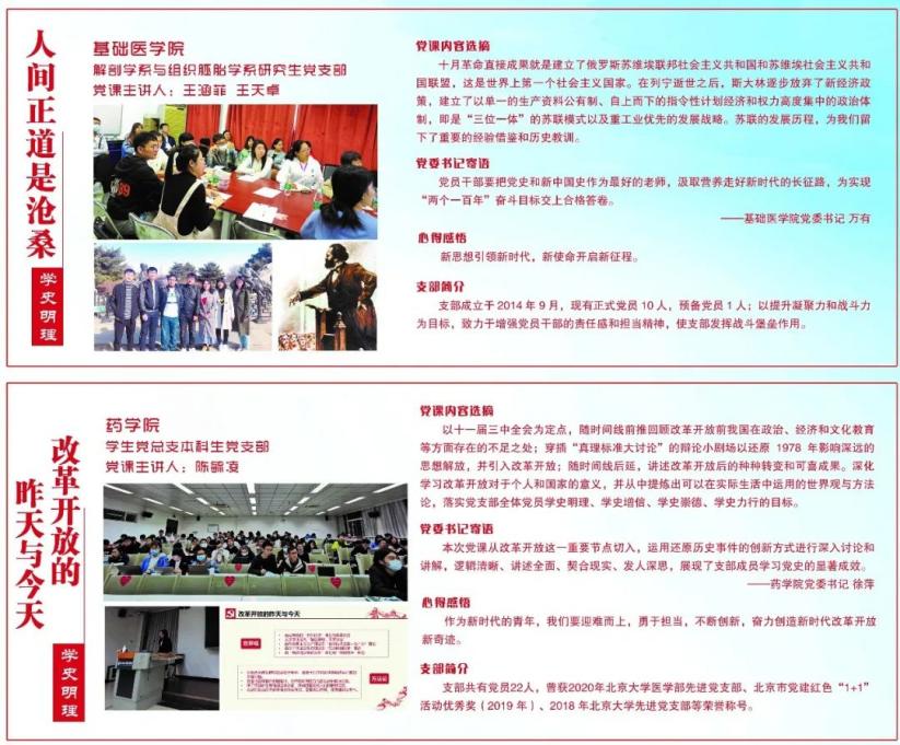 结合建党百年主题夯实青年学生党员理论根基,共8个学院、39个党支部、41堂党课参与,其中3堂党课获评北京大学“百堂精品党课”,分别为:基础医学院解剖学系与组织胚胎学系研究生党支部组织的“人间正道是沧桑”、公共卫生学院卫生政策与管理学系研究生党支部组织的“重温‘春天的故事’:探寻医药卫生事业发展足迹”、第三临床医学院研究生10班党支部组织的“学党史,强信念,跟党走:读懂新时代!”。