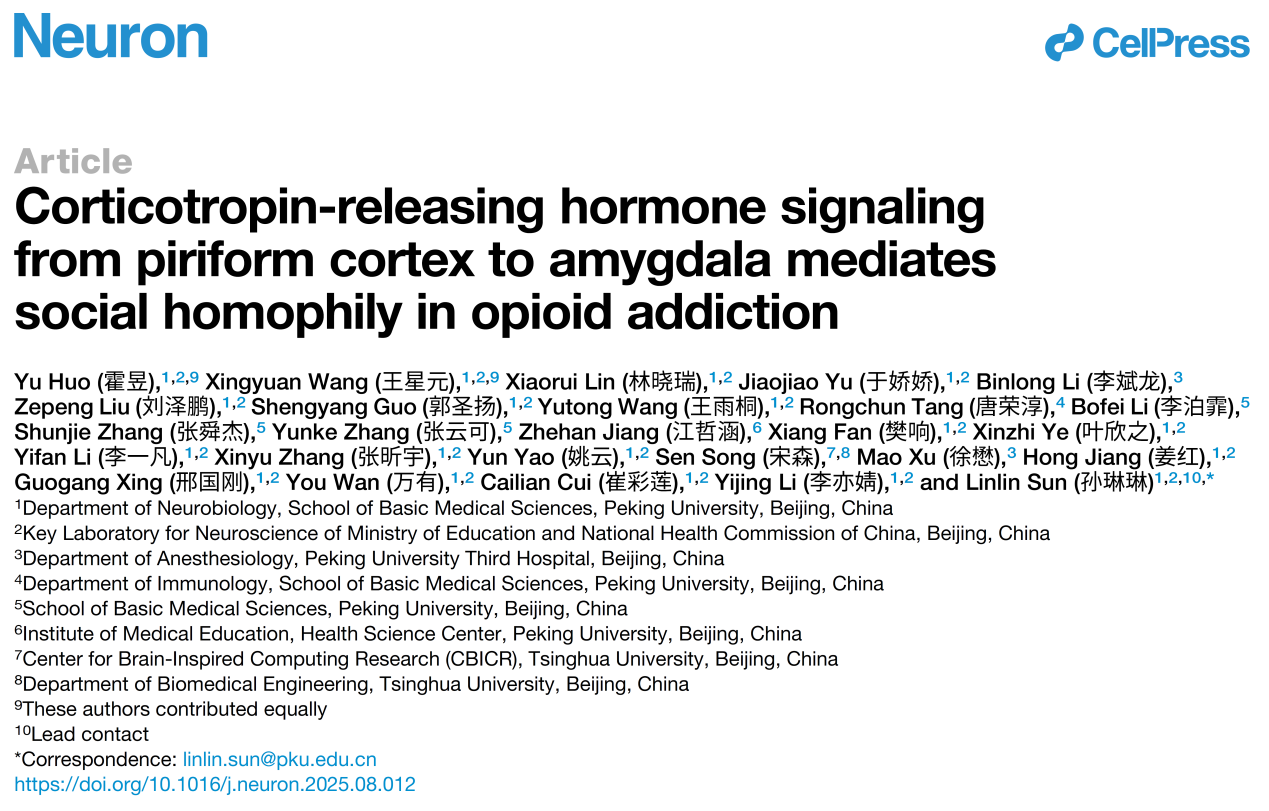 2025年9月12日,北京大学基础医学院孙琳琳团队在学术期刊《Neuron》发表题为“Corticotropin-releasing hormone signaling from piriform cortex to amygdala mediates social homophily in opioid addiction”的研究论文。该研究首次揭示了阿片类药物成瘾个体社交同质性现象,即成瘾个体偏爱与成瘾个体社交,导致其社交圈固化;进一步研究揭示了这种社交同质化的神经机制,为理解成瘾患者社交选择行为及干预治疗提供了全新的理论框架。