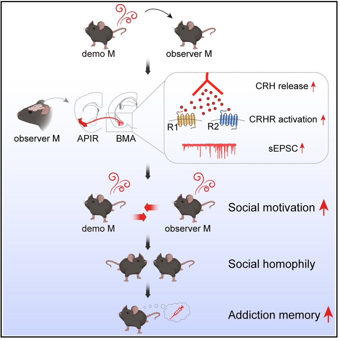 我们的一生,说到底就是一段不断与人相遇的旅程。和谁同行,从来都不是小事—它深刻影响着我们的情绪、选择甚至人生轨迹。正向的社交圈能为我们“充电”,而陷入固化的“负向”圈子,则可能让人难以自拔。该团队研究发现,具有吗啡用药经历的小鼠偏爱与吗啡小鼠社交,这种现象在雌、雄、陌生、熟悉小鼠,吗啡依赖期、戒断期均稳定存在。具体的行为学显示,成瘾小鼠发出特定的气味、特异的身体姿态,其中同类气味可显著增强成瘾小鼠的社交动机,进而介导其社交选择偏爱。机制研究显示,成瘾小鼠释放的特异性气味信息被同伴识别,激活其喙侧梨状皮层(APIR),促使促肾上腺皮质激素释放因子(CRH)释放至基底内侧杏仁核(BMA),作用于其受体(CRHR1和CRHR2),易化突触后神经元激活,介导社交动机增强,成瘾小鼠间社交探索行为增加。进一步研究发现,阻断社交同质化(引入正常非成瘾小鼠)或特异性敲除APIRCRH神经元中的CRH,均能够显著削弱吗啡成瘾相关记忆及复吸倾向,提示APIRCRH-BMA通路是介导成瘾中社交同质性、成瘾记忆强化的关键机制。