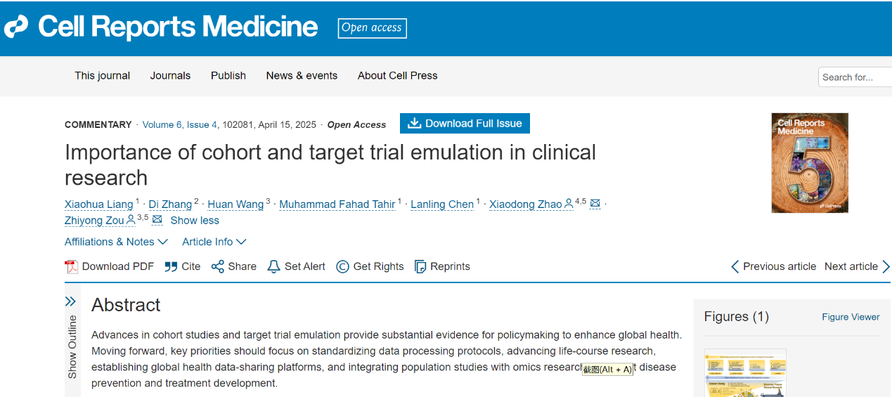 2025年4月15日,Cell系列期刊《Cell Rep Med》创刊5周年之际,在线发表了北京大学邹志勇团队联合重庆医科大学梁小华教授团队的长篇评论文章,题为“Importance of Cohort and Target Trial Emulation in Clinical Research(队列研究与目标试验模拟在临床研究中的重要性)”。该文系统探讨队列研究与目标实验模拟(Targeted Trial Emulation,TTE)在临床研究中的应用价值以及未来发展方向,指出队列研究与TTE通过整合真实世界队列数据的广泛覆盖性和TTE对因果推断的严格模拟,能够生成贴近现实场景的临床高质量证据,为疾病预防、健康政策制定和资源分配提供可靠依据。