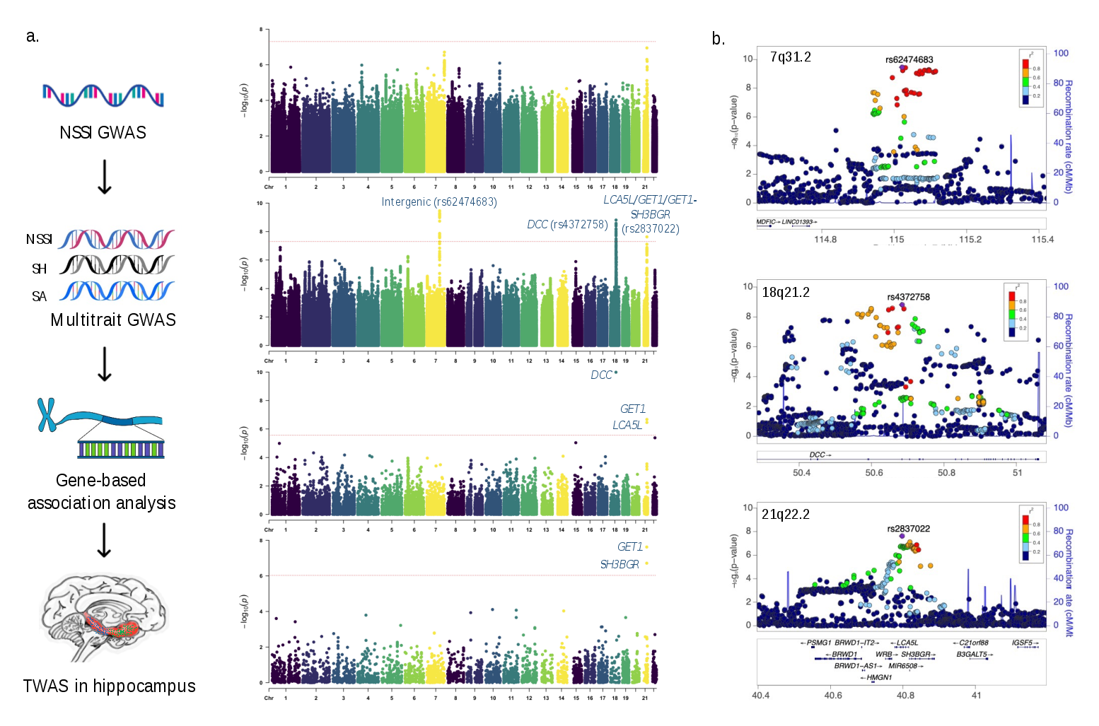•多性状全基因组遗传关联发现了3个NSSI遗传易感区域,海马中与蛋白质转运和信号转导有关的GET1/SH3BGR表达上调与NSSI风险有关