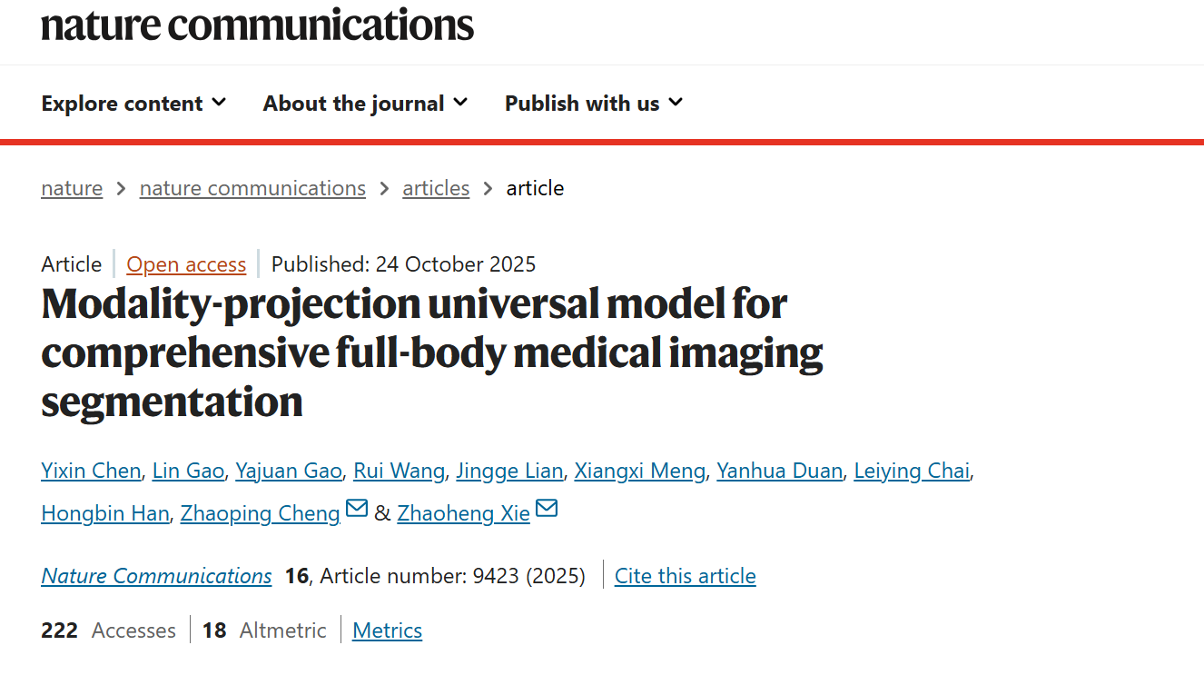 [1] Chen, Y., Gao, L.et al.Modality-projection universal model for comprehensive full-body medical imaging segmentation.Nat Commun16, 9423 (2025).