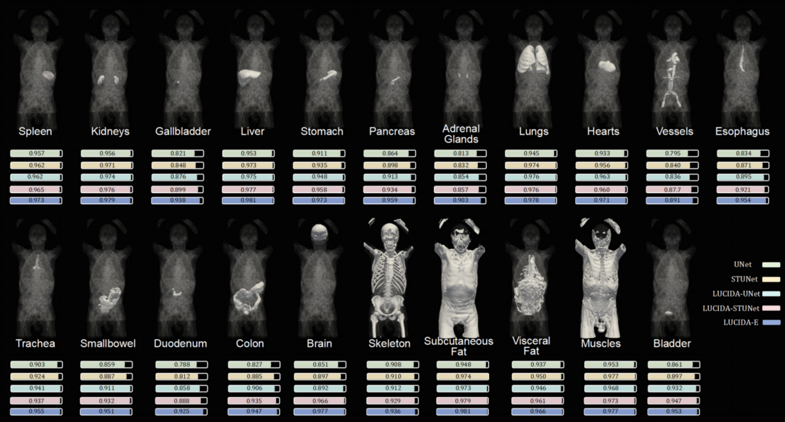 MPUM源自团队在通用分割研究领域的系统积累。团队2023年在IEEE TMI上发表的PCNet模型引入临床专家定义的层级解剖先验,通过“先验类别提示”与“层级类别”强化了解剖关系表达,实现了高泛化性的CT通用分割。 随后在MICCAI会议上发布的LUCIDA模型针对PET/CT中的低剂量CT场景,利用加权分割重建在无标注条件下提升分割精度。基于上述工作,团队最终构建出了跨模态、跨器官、跨条件的MPUM。MPUM的提出为全身系统性疾病研究提供了强有力的图像分析工具,有望推动从”器官级”分析向”全身结构—功能综合表达”的转变,并为构建具备推理与预测能力的”医学图像语言模型”提供新路径,助力医学AI从”局部解析”迈向”全身理解”。