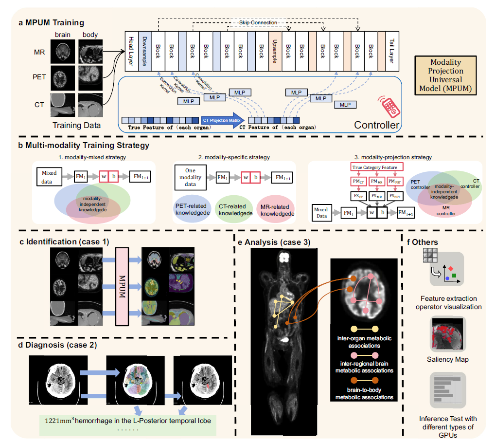 针对上述问题,北京大学医学技术研究院谢肇恒团队提出了模态投影通用模型(MPUM),成果于近日发表于《Nature Communications》。该模型通过“模态投影机制”将不同模态特征映射至共享的潜在空间(Shared-latent space),并根据输入类型自动选择特征路径,实现CT/MRI/PET图像的统一分割。MPUM在861例多模态全身图像上训练,可识别>200种组织结构,无需针对模态微调,即可实现高精度全身分割。 模型引入控制器卷积层以增强可解释性,生成显著性图,帮助临床医生直观理解AI决策。同时,MPUM不仅聚焦结构解析,还支持多器官代谢相关性分析,为全身系统功能研究提供了全新的计算工具,可用于连接多器官结构与功能的系统性分析。